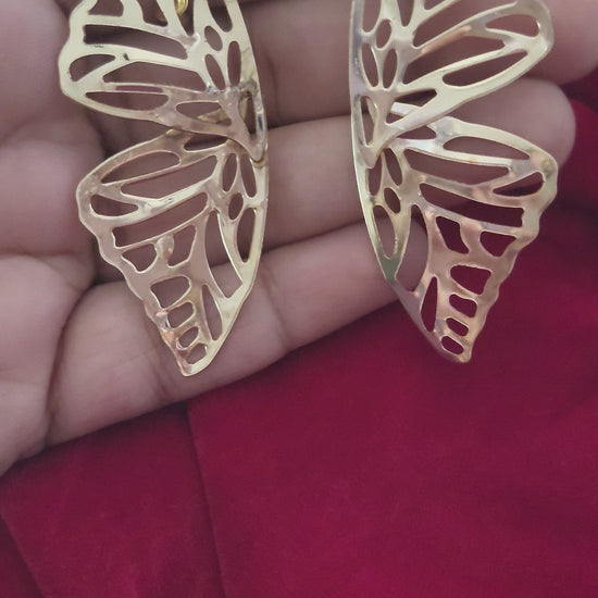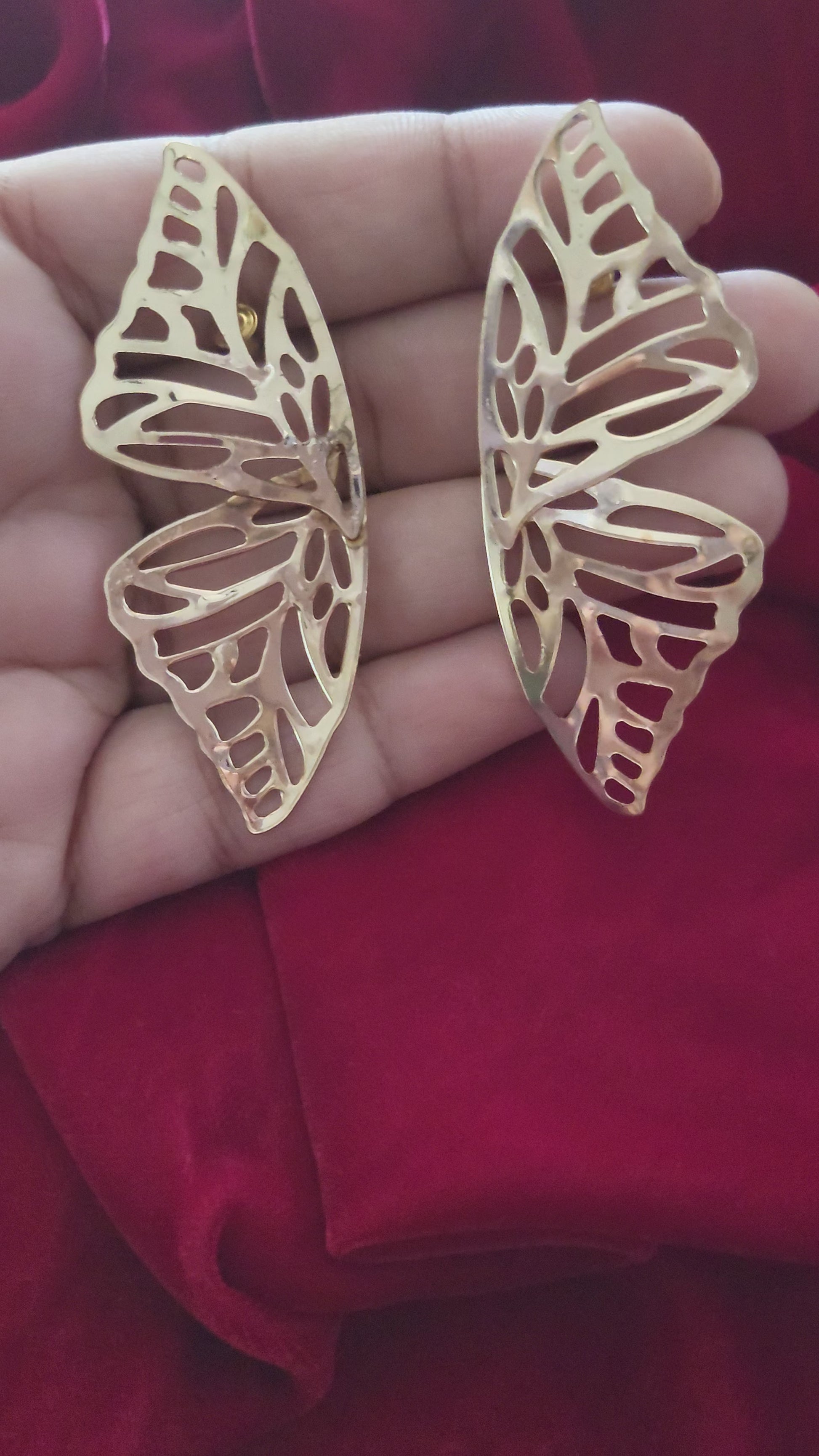 - Discover the delicate beauty of our Butterfly Wing Statement Earrings. These stunning pieces feature a high-polish metallic finish and intricate cut-out details, perfectly mimicking butterfly wings. Lightweight and comfortable, they add a graceful charm to any outfit and make a bold style statement. Perfect for all occasions and gifting.