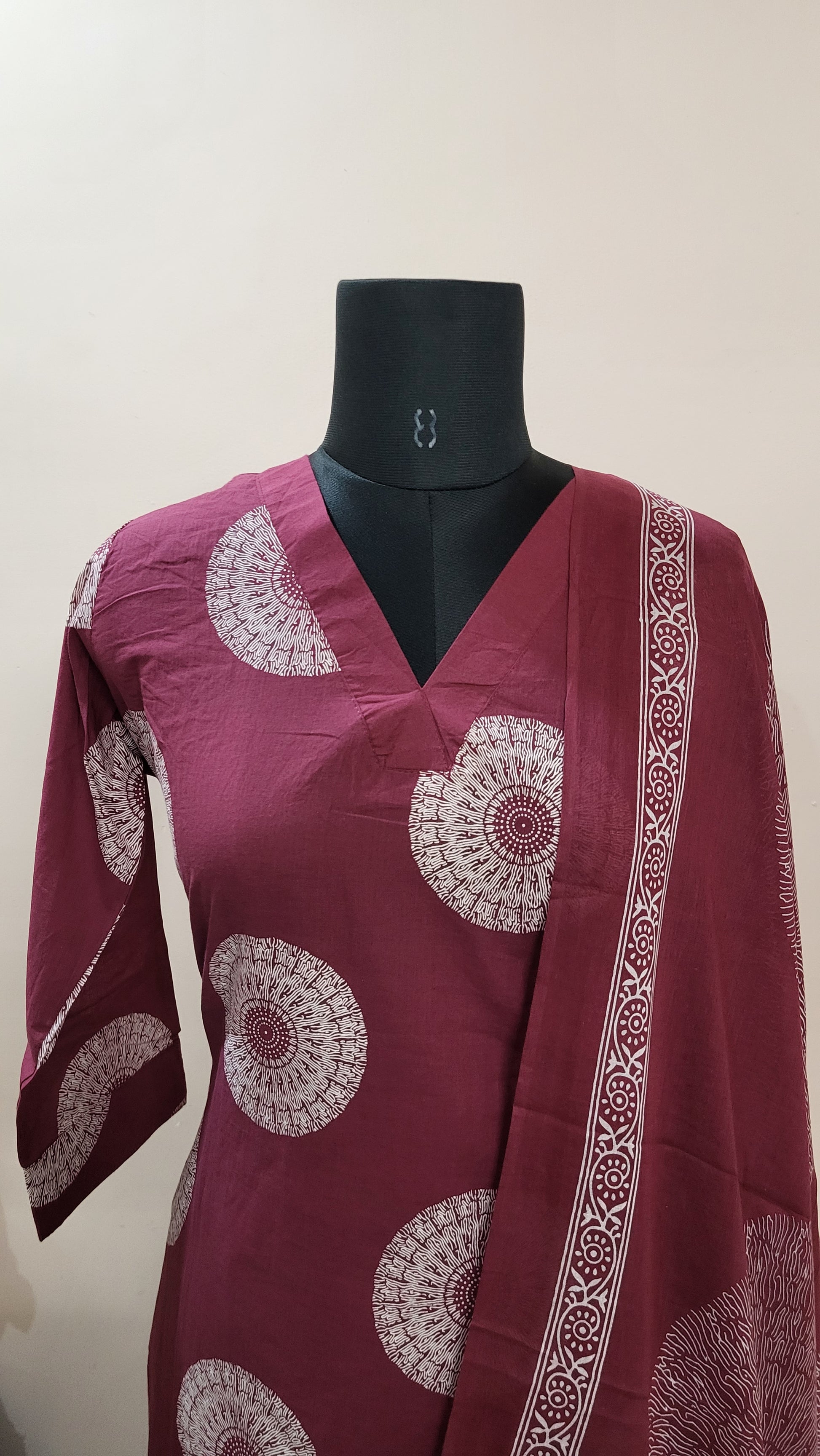 Refresh your ethnic wardrobe with this elegant maroon cotton salwar suit set, designed for comfort and style. The kurta features beautiful circular block prints in white, complemented by a matching printed dupatta and plain maroon pants with a comfortable elastic waistband. Crafted from breathable cotton, this set is perfect for daily wear, festive gatherings, or casual outings.