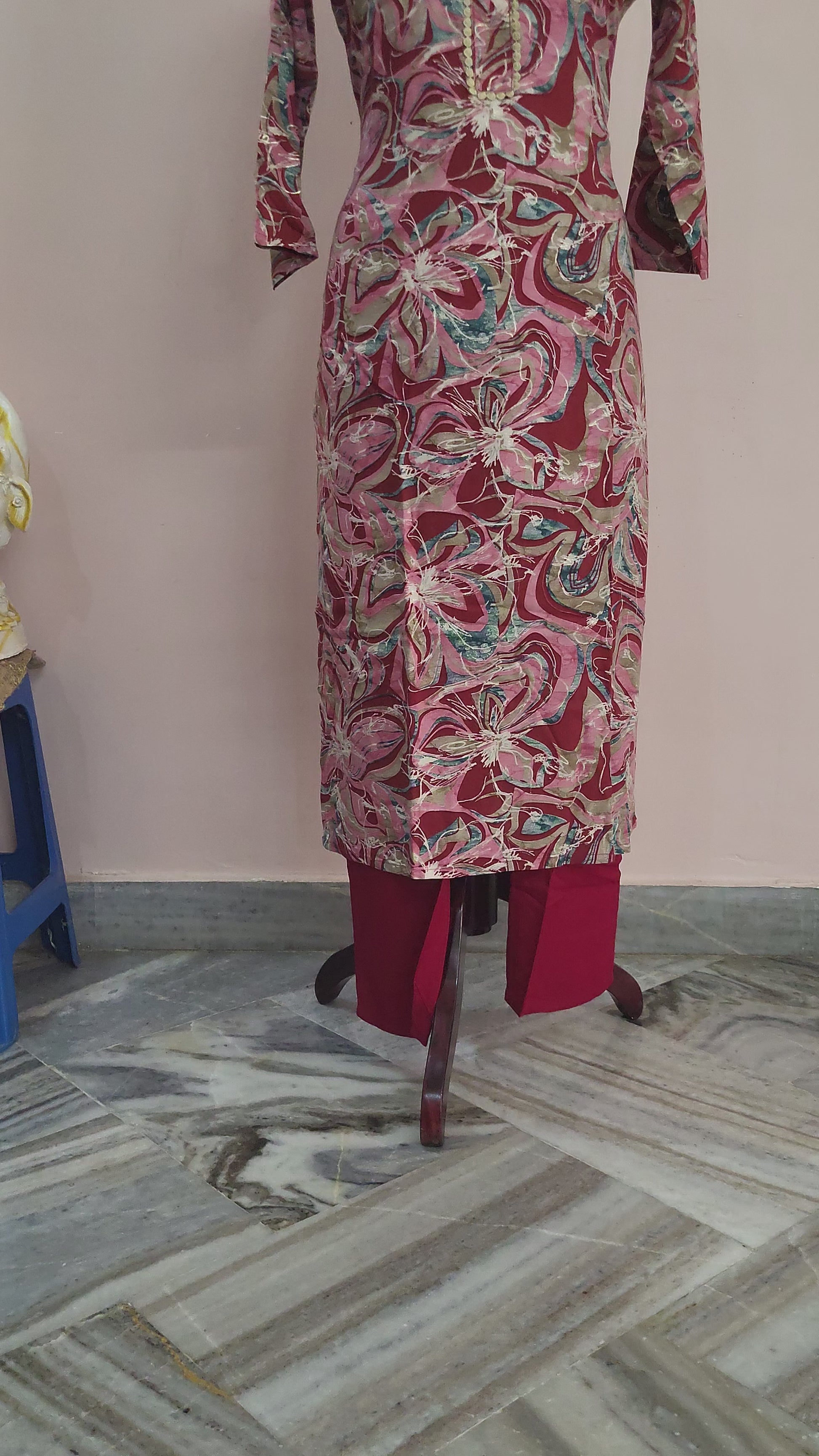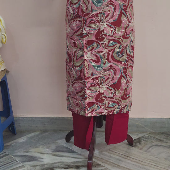 Key Features: Color: Maroon kurta with multi-tone abstract floral print; solid red pants Pattern: Abstract floral design with lace-trim neckline Neckline: V-neck with lace detailing Sleeves: Three-quarter sleeves Hemline: Straight cut with side slits Bottom Wear: Solid red straight pants with elasticated waist Fabric: Lightweight, breathable, and skin-friendly Occasion: Office wear, casual outings, festive gatherings Care Instructions: Gentle machine wash, do not bleach