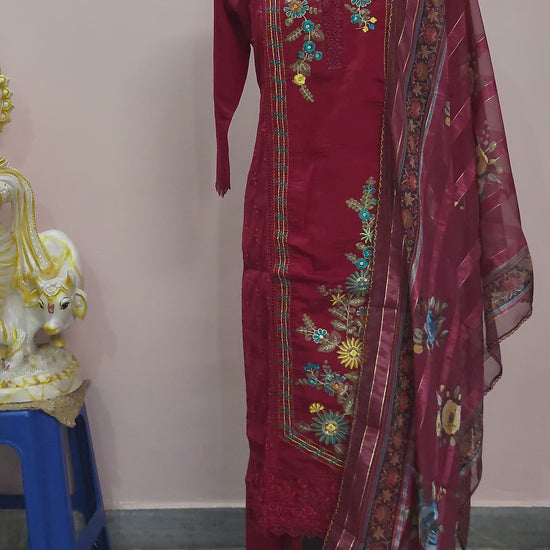 Make a bold style statement with this Maroon Embroidered Kurta Set with Printed Dupatta. The kurta features vibrant floral embroidery in shades of turquoise, mustard, and gold threadwork, highlighted with intricate detailing along the neckline and hem. Crafted in soft, comfortable fabric, this outfit brings together tradition and elegance.