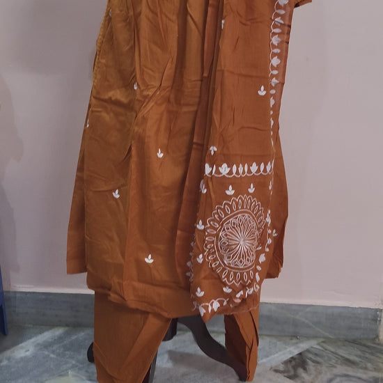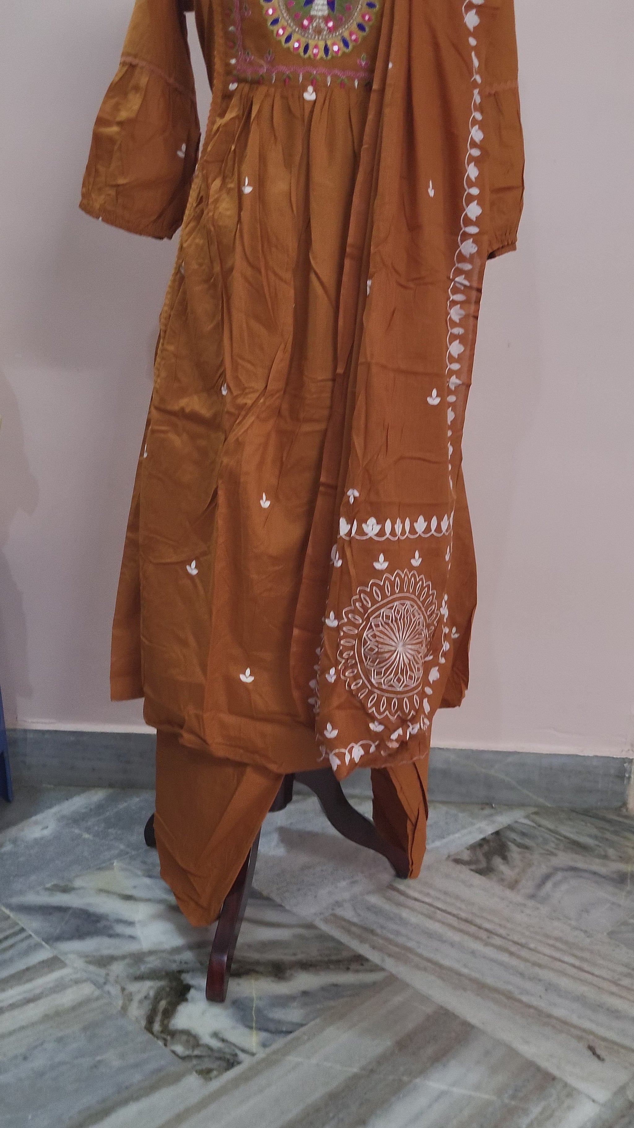 Step into timeless elegance with our Mustard Brown Embroidered Peacock Kurta Set. This three-piece ensemble features a beautifully hand-embroidered peacock motif on the front, enhanced with vibrant pink, green, and white threadwork along with delicate mirror embellishments. The soft cotton fabric ensures all-day comfort, while the flared sleeves add a touch of charm. Paired with matching plain pants and a coordinating dupatta adorned with intricate white floral embroidery, this set is perfect for festive occasions, cultural gatherings, or casual ethnic wear.