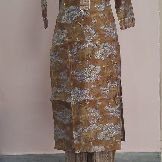 Product Details: Top Color & Pattern: Mustard base with all-over lotus print and embroidered lace neckline Bottom Color & Pattern: Mustard-toned striped ethnic print Sleeves: 3/4th sleeves with printed cuffs Neckline: Round neck with placket detailing Fabric: Soft and breathable cotton blend Fit: Straight cut for a sleek silhouette Occasion: Everyday wear, office, casual gatherings Wash Care: Gentle hand wash or mild machine wash