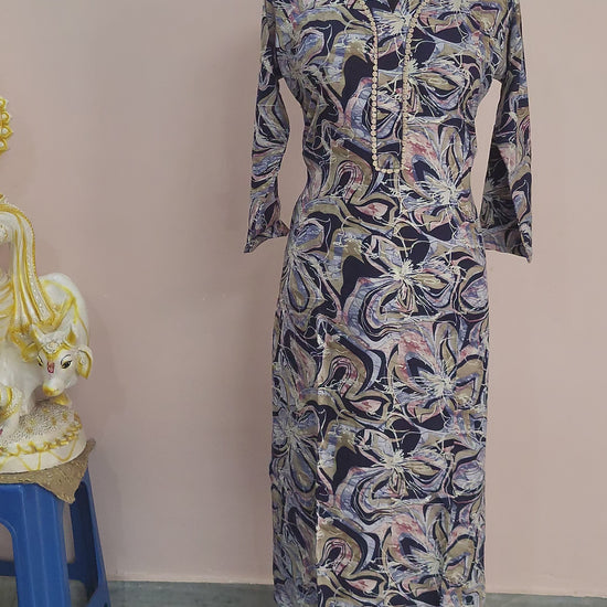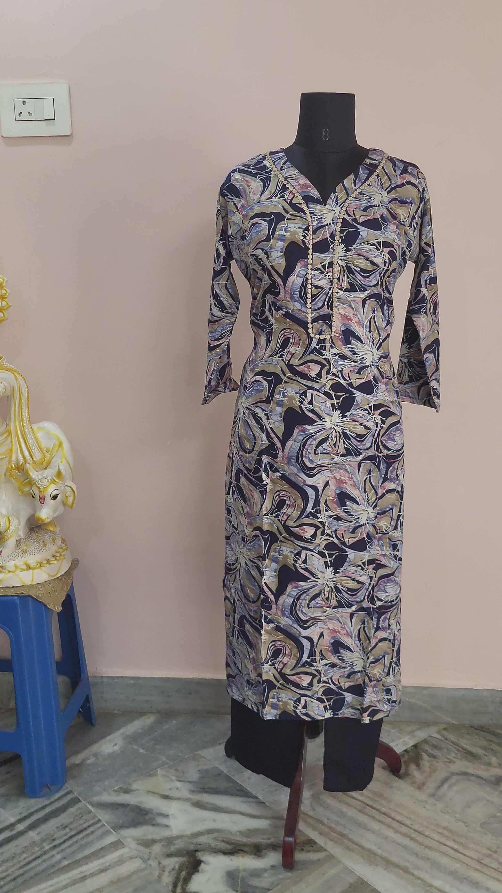 Color: Navy kurta with multicolor abstract floral print; solid black pants Pattern: Abstract floral motifs Neckline: V-neck with lace trim detailing Sleeves: Three-quarter sleeves Hemline: Straight cut with side slits Bottom Wear: Solid black straight pants with elasticated waist Fabric: Soft, lightweight, and breathable for all-day wear Occasion: Office wear, casual outings, semi-formal events Care Instructions: Gentle machine wash, do not bleach
