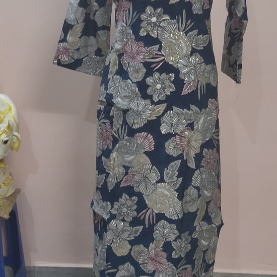 Product Details: Fabric: 100% Cotton Color: Navy Blue with Multicolor Floral Prints Pattern: All-over Floral Print Kurta with Striped Pants Kurta Style: Straight Fit with Side Slits Neckline: Notch Neck Sleeves: 3/4th Sleeves Bottom: Striped Cotton Pants Occasion: Office Wear, Casual Outings, Day Events Care Instructions: Gentle machine wash or hand wash in cold water.