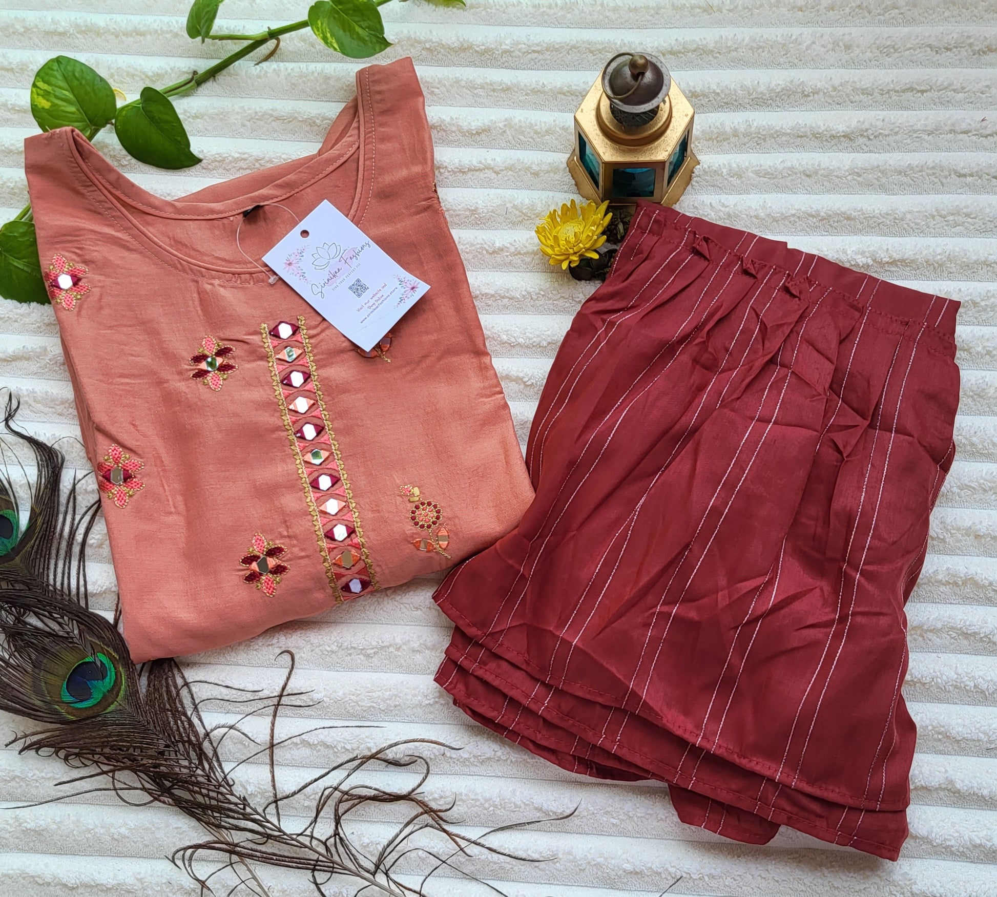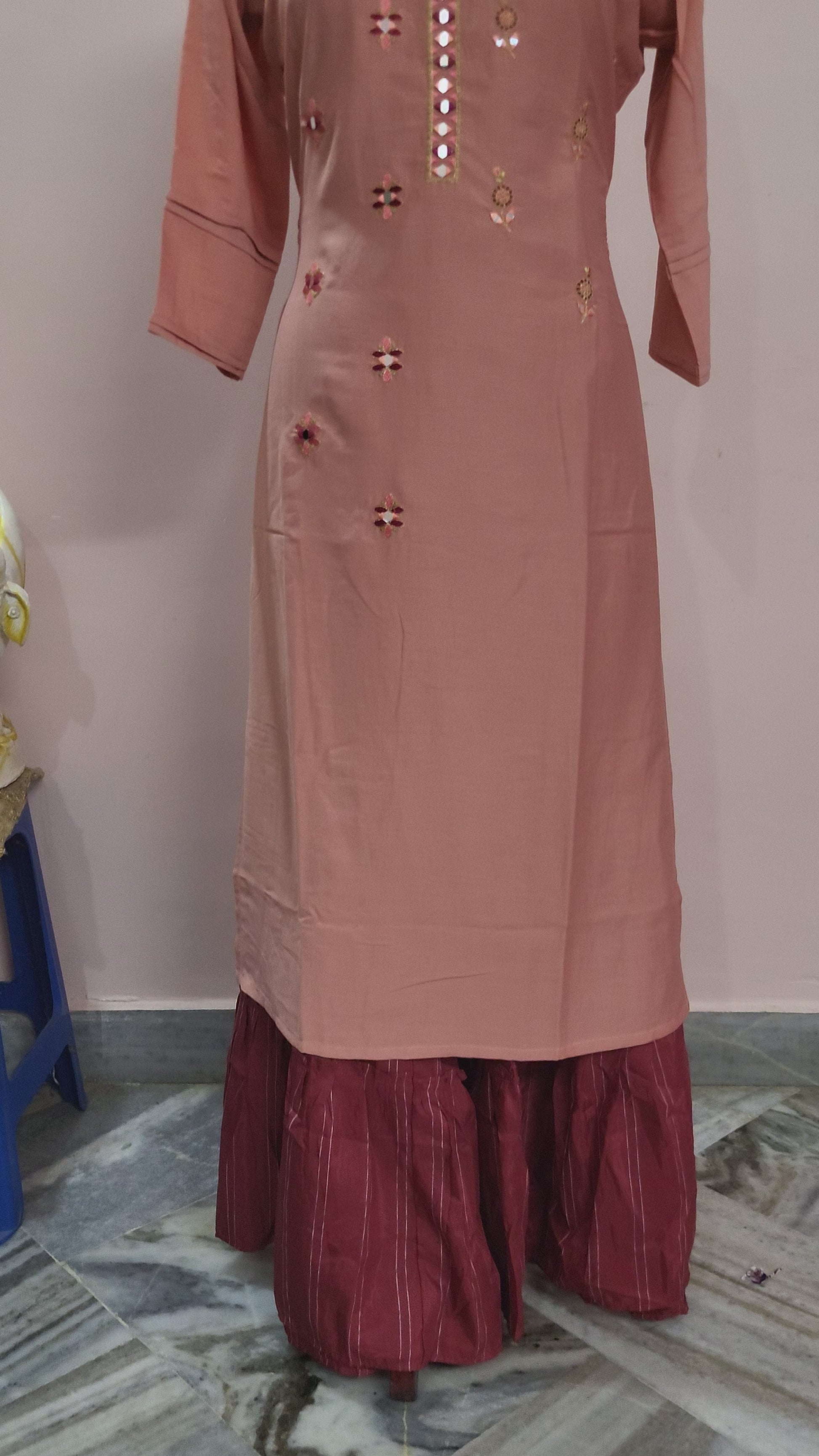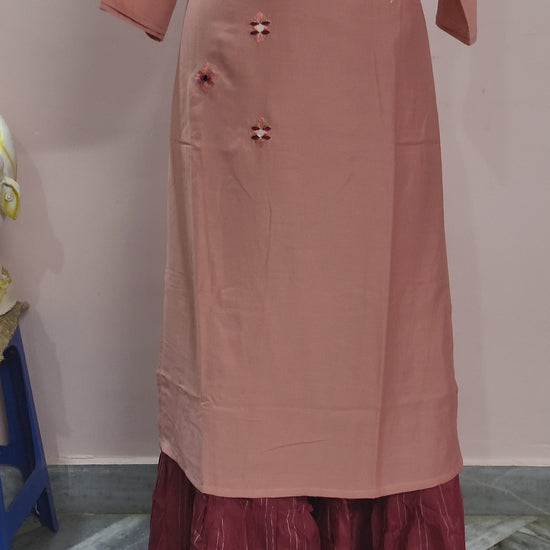 Key Features: Color: Peach kurta with maroon palazzo pants Pattern: Mirror-work and floral embroidery on the yoke and front Neckline: Classic round neck Sleeves: Three-quarter sleeves with cuff detailing Hemline: Straight cut with side slits Bottom Wear: Comfortable maroon striped palazzo pants Fabric: Soft and breathable for all-day comfort Occasion: Festive wear, party wear, ethnic celebrations Care Instructions: Gentle hand wash recommended, do not bleach