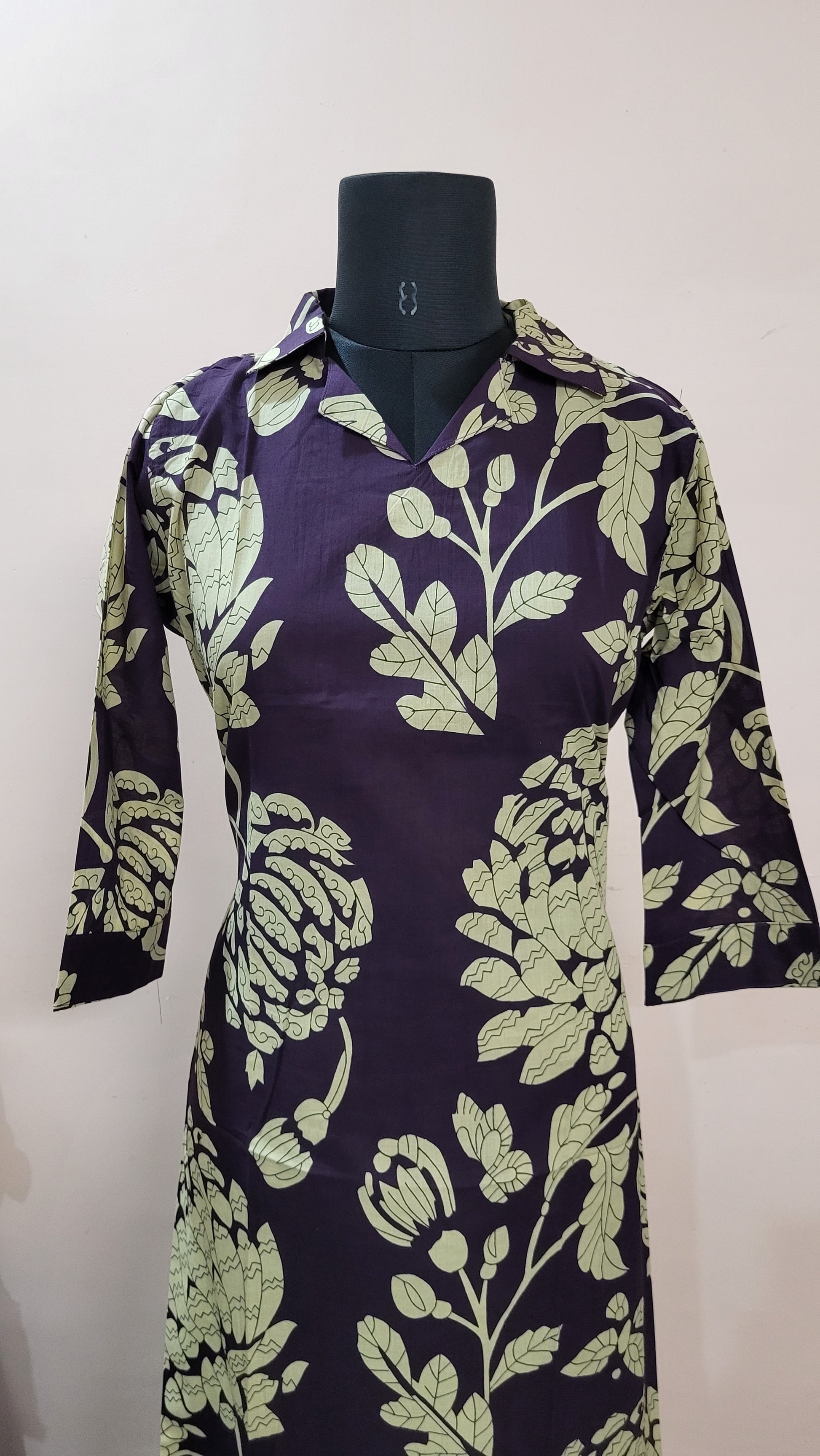 Elevate your everyday ethnic look with this stunning purple shirt-style kurta set. Adorned with bold beige floral prints, the kurta features a smart shirt collar and three-quarter sleeves, adding a modern twist to traditional wear. The straight-cut silhouette with side slits ensures ease of movement, while the matching printed pants complete the coordinated look. Crafted from soft, breathable fabric, this set is perfect for office wear, casual outings, or relaxed festive gatherings.