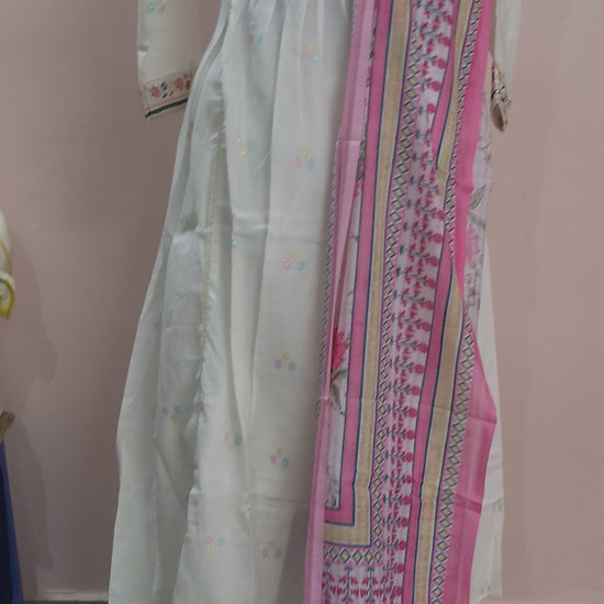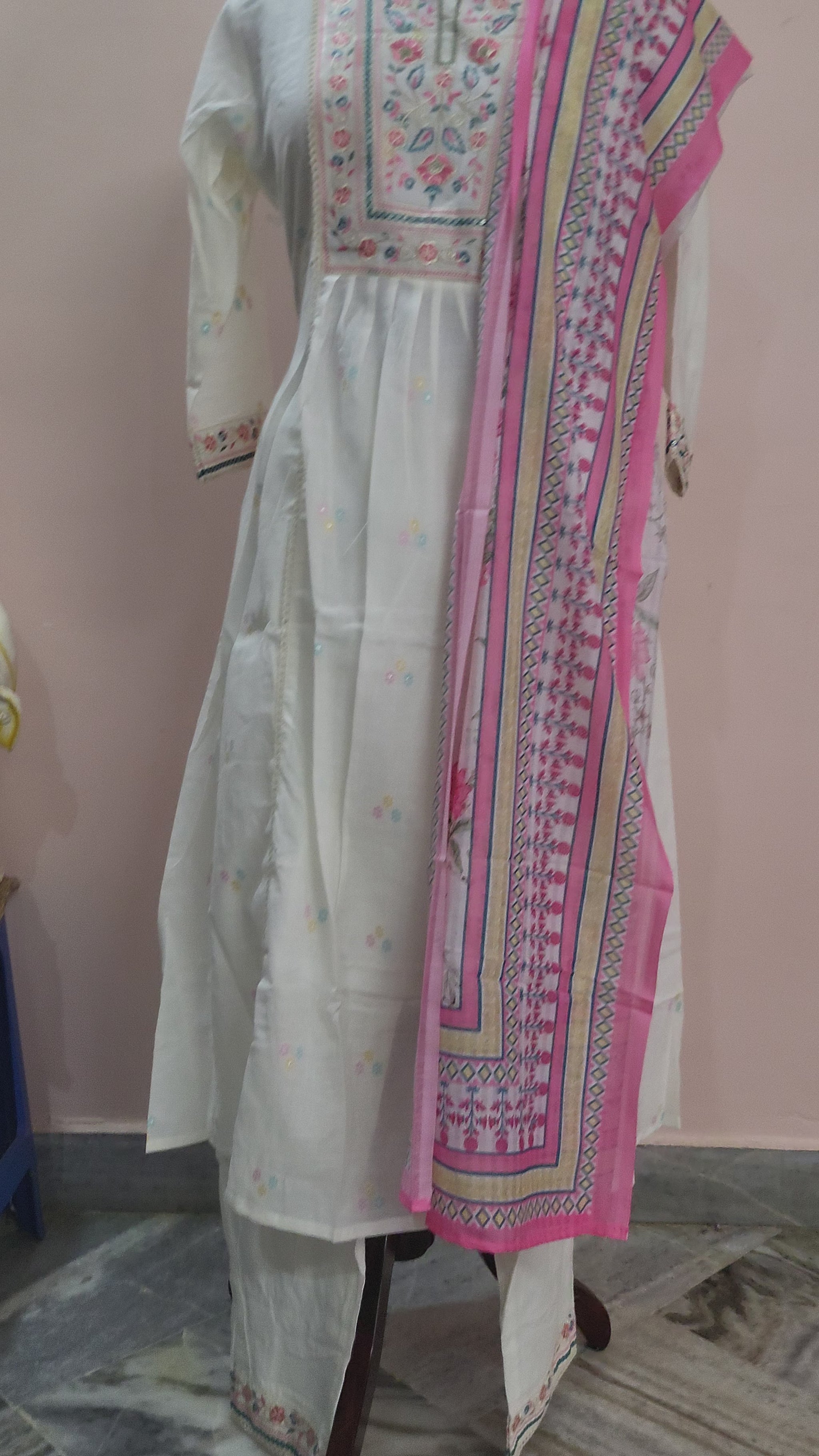 Product Details: Fabric: 100% Cotton Color: White with Multicolor Embroidery Pattern: Floral Embroidery & Subtle Prints Kurta Style: Anarkali with Calf-length Hem Sleeves: 3/4th Sleeves with Embroidered Edges Bottom: Straight Pants with Embroidered Hem Dupatta: Pink Printed Cotton Dupatta Occasion: Festive, Casual, Daytime Events Care Instructions: Gentle hand wash separately in cold water.